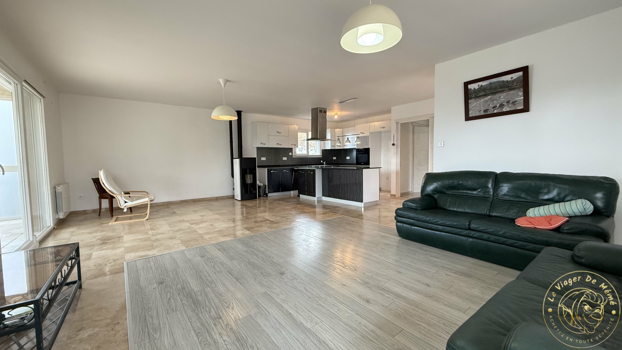 Superbe pièce de vie de 57 m² avec cuisine américaine et poêle à granulés